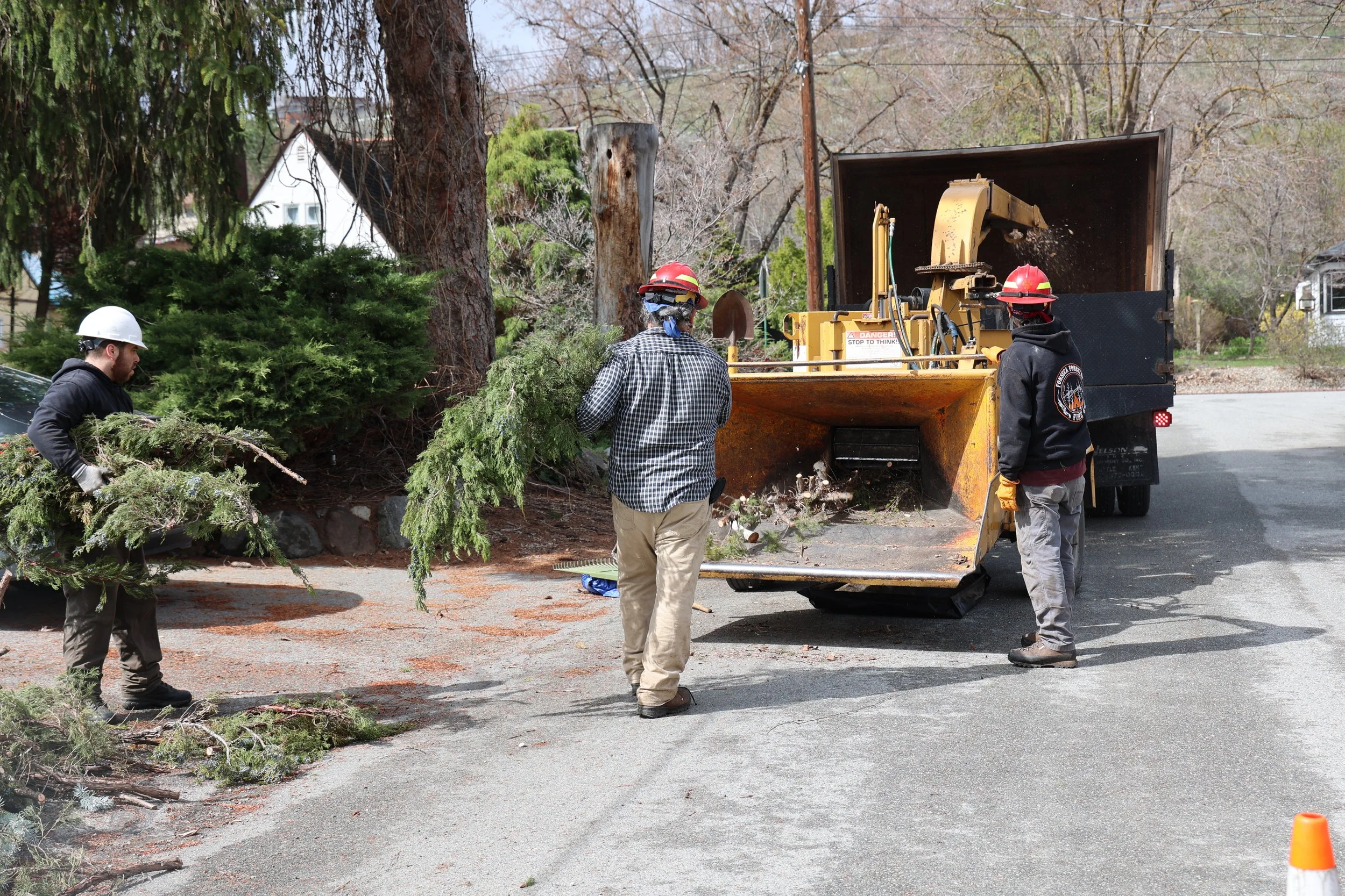 A chipper will come through the communities and chip the woody materials. After materials are chipped, the chips will be left in place of the pile or transported to a central drop off area.
